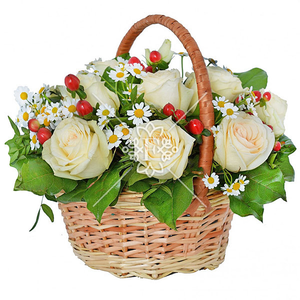 Обратите свое внимание на изящную композицию в корзине «Сказочное утро». Прекрасные молочно-белые розы на фоне красного гиперикума и белой ромашковидной хризантемы выглядят совершенно. Композиция вызывает восторг, окутывает нежным ароматом и чарует невероятной нежностью!